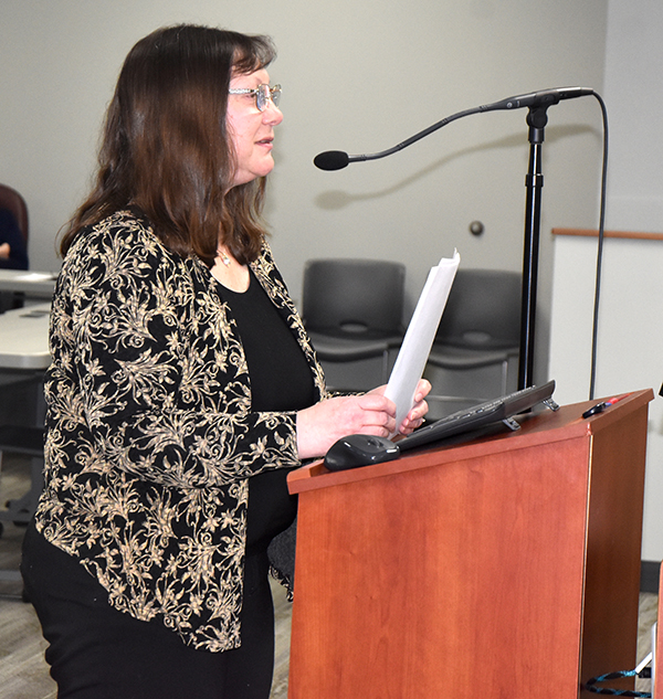 T-R PHOTO BY ROBERT MAHARRY City of Marshalltown Finance Director Diana Steiner discusses long-term debt and property tax levy rates during Monday night’s special meeting.