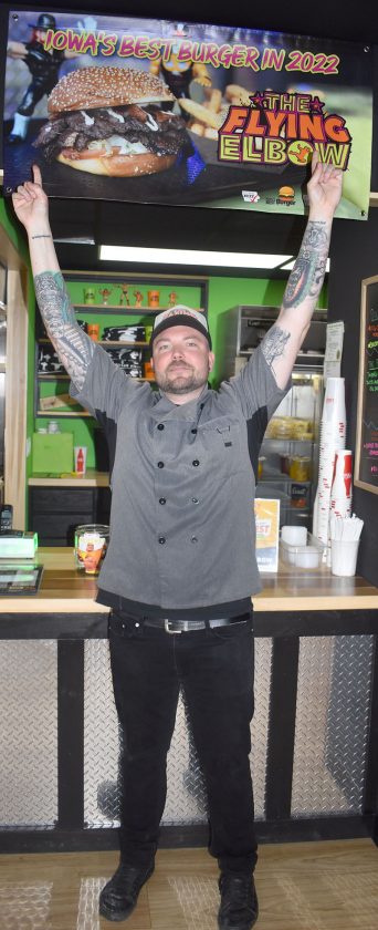T-R FILE PHOTO — Garrett Goodman, the owner/operator of The Flying Elbow in Marshalltown, points to a sign above the counter designating his restaurant as serving the best burger in Iowa for 2022. In honor of the contest’s 15th anniversary, past winners including the Elbow will be allowed to re-enter in 2024.