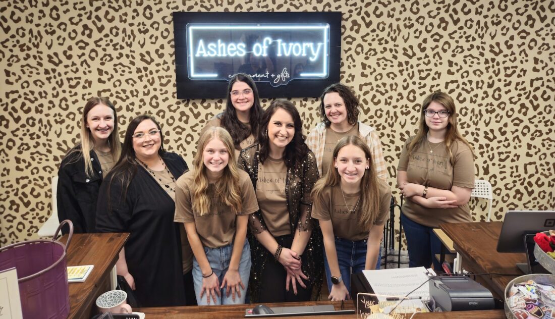 T-R PHOTO BY JAKE RYDER — The employees of Ashes of Ivory Consignment & Gifts and daughters of owner-operator Steph Stolzman, center, are pictured at the new store — Mya Stolzman, Natalia Meester, Veda Aldrich, Liz Clayton, Stolzman herself, Kathryn Bartling, Maycee Stolzman and Braelyn Schafer.
