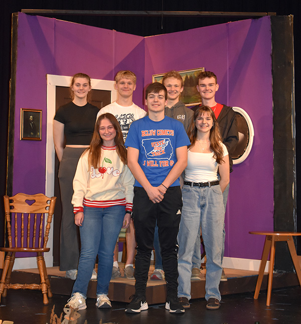 T-R PHOTO BY ROBERT MAHARRY The main cast of the BCLUW Drama Department’s upcoming production of “Clue” poses for a photo last week. Front row, from left to right, Olivia Rolston, Logan Scafferi and Leila Wedgwood. Back row, from left to right, Savannah Moeller, Cayden White, Sam Garber and Mason Martin. The show will be performed Friday and Saturday nights at 7 p.m. and Sunday at 2 p.m. at the high school auditorium.