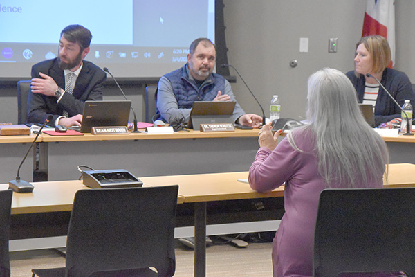 T-R PHOTO BY LANA BRADSTREAM Marshalltown High School Principal Jacque Wyant tells Board President Sean Heitmann, Superintendent Theron Schutte and board member Leah Stanley about the necessity of hiring three additional teachers for MHS during the meeting on Monday night.