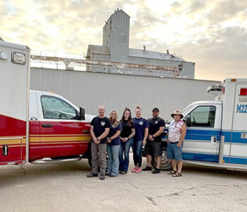 - CONTRIBUTED PHOTO — Jacob Patterson, Kristen Patterson, Ashley Krimmer, Gilman Fire and Rescue EMS Chief Jessica Cecak, Curtis Cecak and Phil Summers stand next to their ambulances recently. The first responder service is trying to become a transporting agency. Not pictured are Gary Sears and Amanda McCrary.