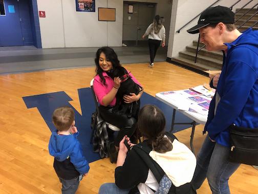 T-R PHOTO BY MIKE DONAHEY — Erika Melchor, seated, volunteer services coordinator with the local Animal Rescue League, holds Judd, a German Shepherd-Labrador mix at the Healthy Family Fair, while attendees look on. The event was held Saturday at the Marshalltown High School Roundhouse.