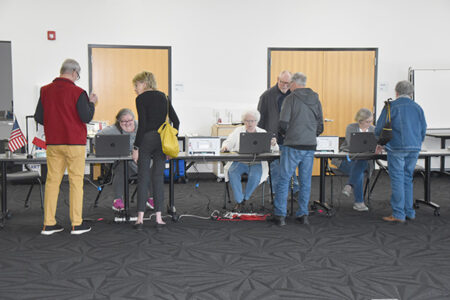 - T-R PHOTO BY ROBERT MAHARRY —Chuck Bailey, right, checks in with poll worker Cindy Brodin, left, at Redeemer Lutheran Church, where Wards 3 and 4 voted in the city and school district special election, on Tuesday afternoon. Also pictured behind Bailey is Marshalltown High School Principal Jacque Wyant.