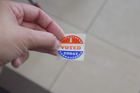 - A Marshalltown resident peels the familiar “I Voted” sticker off of the paper after submitting a ballot at the Marshalltown Public Library. Residents were given the chance to decide whether or not to continue PPEL for the Marshalltown Community School District and LOSST for the city.