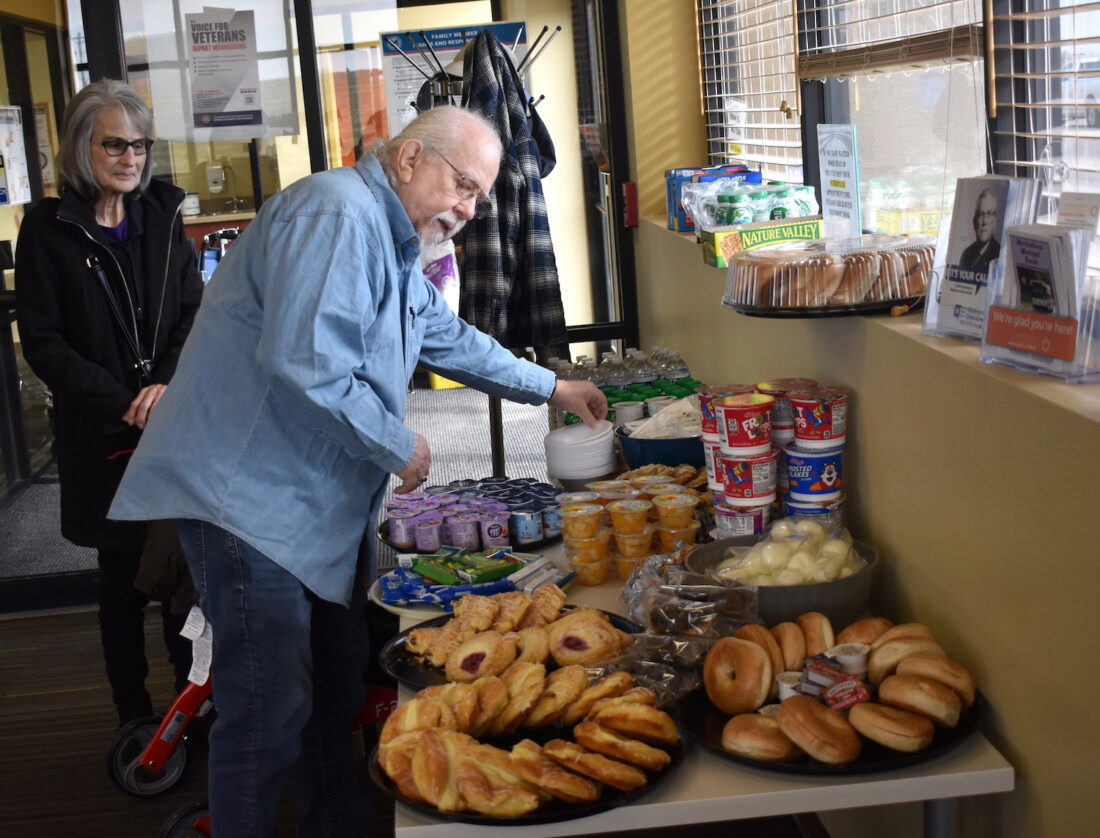 The Veterans Affairs (VA) Clinic in Marshalltown, as part of its efforts to give back to those who have served, offered a free “Wakey, Wakey Breakfast Takey” last Thursday morning. Pictured is Air Force Veteran Bob Moore of Marshalltown, accompanied by his wife Linda, enjoying some of the offerings.