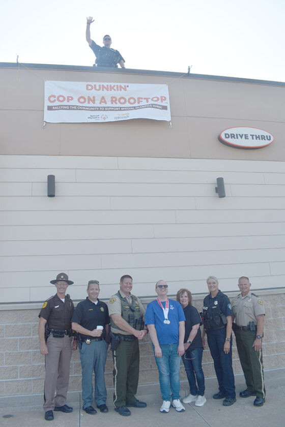 The annual “Cop on a Rooftop” fundraiser at the Marshalltown Dunkin’ Donuts location was a big success Friday morning with participation from several local law enforcement agencies. A total of $2,908 in donations were raised for Special Olympics Iowa. Pictured, from left to right, are Rod Larson of the Iowa State Patrol, Marshall County Sheriff’s Office Deputy Investigator Ian Winfield, Marshall County Chief Deputy Ben Veren, local Special Olympian Blaine Fisher, Blaine’s mother Kandy Fisher, part-time State Center Officer Casee Veren, Sheriff Joel Phillips and, on the rooftop, Marshalltown Police Department Sgt. Paul Heitman.