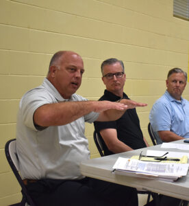 - T-R PHOTOS BY ROBERT MAHARRY — East Marshall Superintendent Tony Ryan, left, speaks while Jerry Gallagher of the Donovan Group and Matt Gillaspie of Piper Sandler Investments look on during a public meeting about the proposed $13.5 million bond issue at the high school cafeteria in Le Grand on Wednesday evening.