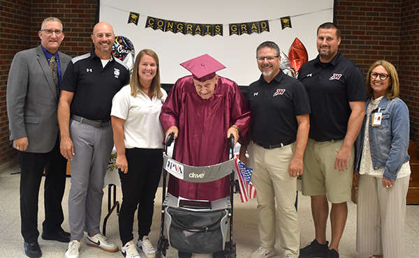 John Hanna, a current Iowa Veterans Home resident, graduated from Waterloo West High School in 1963 and went off to serve his country shortly thereafter as the Vietnam War kicked into high gear. Somewhere along the way, he lost his diploma, but over 60 years later, he finally got a new one. With some help from IVH leadership and the administration at West High School, who traveled down from Waterloo, Hanna got a new diploma on Wednesday morning and gave a brief speech donning his cap and gown before a short reception with cake and punch. He even got the chance to toss his cap in the air, and it’s safe to say that at that moment, Hanna felt young again. Pictured, from left to right, are Commandant Todd Jacobus, West High School Principal Andy Miehe, West Assistant Principal Allie Hildman, Hanna, Assistant Principal Brian Ortman, Assistant Principal Wade Timmins and IVH Licensed Nursing Home Administrator Penny Cutler-Bermudez. T-R PHOTO BY ROBERT MAHARRY