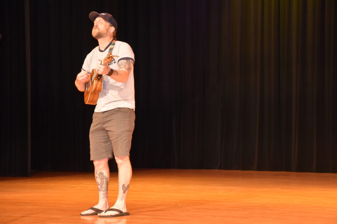 T-R PHOTO BY LANA BRADSTREAM - Lenihan Intermediate Art Teacher Nick Beard sings an original song he wrote and plays the ukulele during rehearsal for Saturday’s variety show. In addition to original music, performers will show off their skills in acts such as juggling, skits and poetry.
