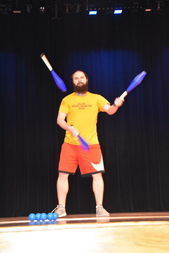 T-R PHOTO BY LANA BRADSTREAM – Jaleb Jay practices his juggling for the variety show on Saturday. He is one of 10 performers displaying their talents on Saturday. Proceeds from the show will go toward the Marshalltown Community Theater Kids’ Acting Academy performance of “Finding Nemo, Jr.” in 2025.