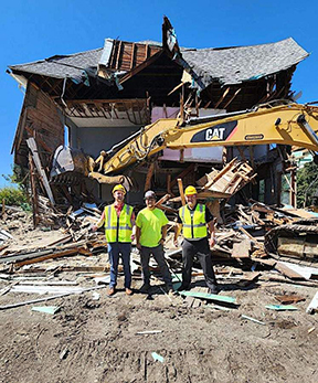 PHOTO COURTESY OF JORDY BROWN North Tama Principal Taylor Howard, right, smiles alongside assistant principal Jordy Brown, left, and Larson Construction’s Chris Henschel on Sept. 4 during demolition of the home at 600 S. Main St. located on the east side of the district’s campus. The home, which was acquired in 2021 by the district for $98,500, is one of two along Highway 63 that will be demolished to make way for a new high school addition. Construction on the addition is slated to begin this week.