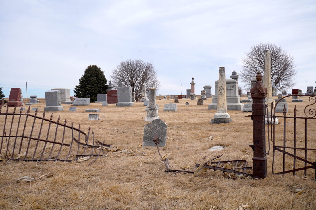 T-R PHOTO BY RUBY F. MCALLISTER — West Union Cemetery located southeast of Traer in Perry Township is pictured on Friday, Feb. 28. Sometime in mid-January, several of the cemetery’s headstones as well as a portion of the historic perimeter fence sustained damage when a vehicle crashed through the fence and drove around haphazardly. The township cemetery was platted in 1856.