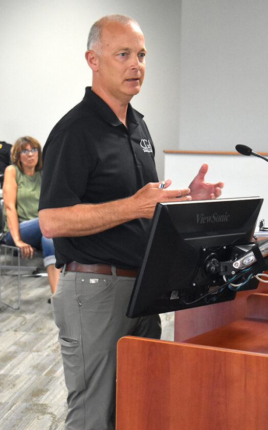 T-R PHOTO BY ROBERT MAHARRY — Clapsaddle Garber Associates President/CEO Matt Garber addresses the Marshalltown city council with a cost sharing request for the removal and relocation of the company’s utility vault during Monday night’s meeting. CGA is headquartered inside the City Centre building at 16-18 E. Main St.