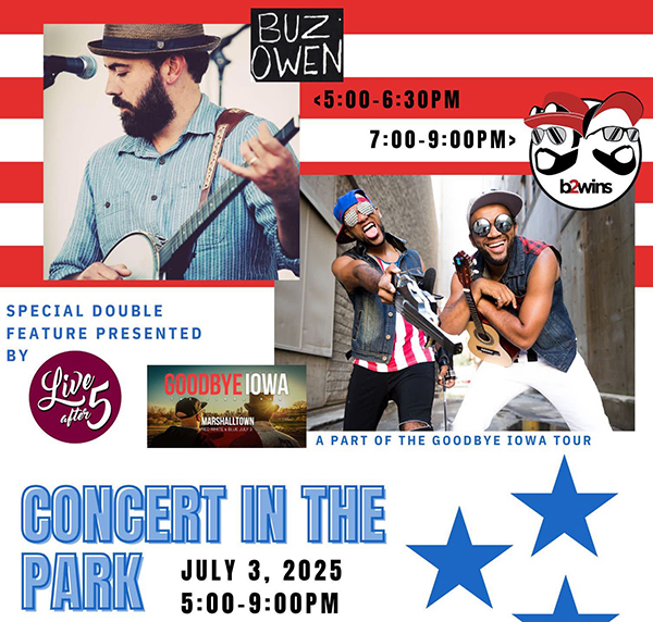 • July 11, Exit 185, a band with known roots in Marshalltown who play hits from a variety of genres;