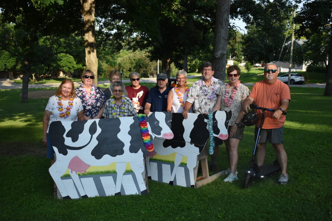 T-R PHOTO BY JONATHAN MEYER An advertised theme of the night was “A meeting of the cows,” the mascots of the fundraising campaign. The two cows could be seen inching closer together through the 100 day duration of the project, and members of the Hometown Action Team (HAT) posed for a photo with them to celebrate reaching the goal.