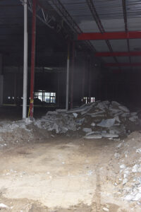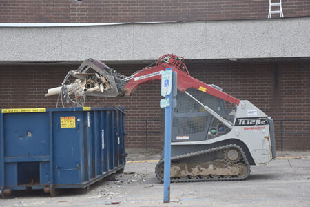 - T-R PHOTOS BY LANA BRADSTREAM — A construction worker carries a load of rubble from the area of the Marshalltown Mall that JC Penney was located in. Extensive interior work has been done in that mall area, preparing for hopeful new tenants.