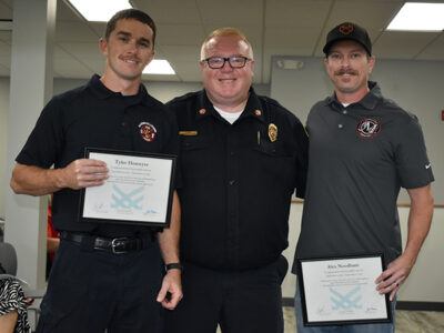 - Marshalltown firefighters Tyler Homeyer, left, and Alex Needham, right, were honored for 10 years of service to the MFD during Monday night’s meeting. They are pictured with Fire Chief Christopher Cross, center.