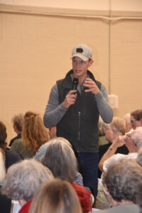 - T-R PHOTOS BY LANA BRADSTREAM — Iowa gubernatorial candidate Democrat Rob Sand answers questions during his Marshall County Town Hall on Friday at the Veterans Memorial Coliseum. Sand stressed his dislike of politics as usual, and told the crowd it is time for a change.