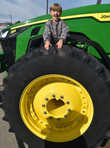 - Teddy Grabau has a laugh while checking out the tire of a John Deer
