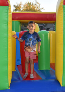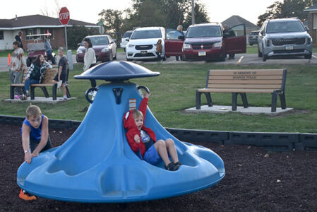The event, which began at 11 a.m. and concluded at dusk with an outdoor showing of the movie “Hocus Pocus” in the amphitheatre, included inflatables, food trucks (Dave’s Mini Donuts, Smokin’ G’s, Clare’s Tenderloins by Mya and Sno 2 Go), a mini golf course, live music from Le Grand Parks and Rec Committee Member Trevor Parrish, face painting, a pickleball tournament and a booth promoting the “Vote Yes” committee for upcoming East Marshall bond issue. But most of all, it was about the brand new park equipment that the committee, in partnership with the nonprofit organization Celebrate Le Grand, led a $240,000 fundraising effort that included commitments from both the city of Le Grand and Marshall County, a Community Attraction and Tourism (CAT) grant from the Iowa Economic Development Authority (IEDA), the Assistance League of Marshalltown and a number of private contributions.