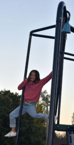 - Meilah Legg shows off some acrobatics on the new park equipment in Le Grand during Saturday’s celebration.