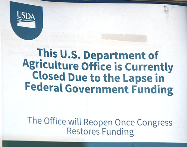 T-R PHOTO BY LANA BRADSTREAM A sign hangs on the entry door of the Marshall County United States Department of Agriculture Service Center on South 2nd Street in Marshalltown. The office will remain closed until the federal government shutdown ends.