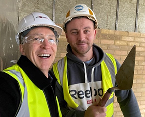 - CONTRIBUTED PHOTO — Carter, left, poses for a photo with a bricklayer holding a MARSHALLTOWN trowel during a trip to England.