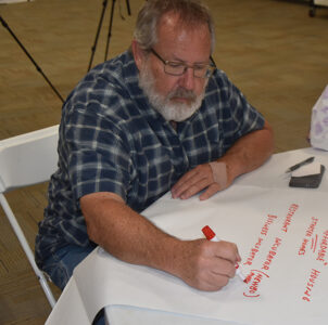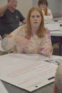 - Leigh Bauder writes a list of big ideas and top priorities she and the people at her table have for the town. Roughly 60 people met for the Reimagine Marshalltown Community Roundtable and split into separate groups to come up with ideas.