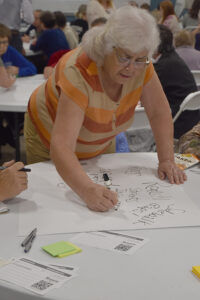 - T-R PHOTOS BY LANA BRADSTREAM — Spread out in a room in the Veterans Memorial Coliseum, Marshalltown residents write down their big ideas and priorities for the community. They were gathered for the Reimagine Marshalltown meeting last night.