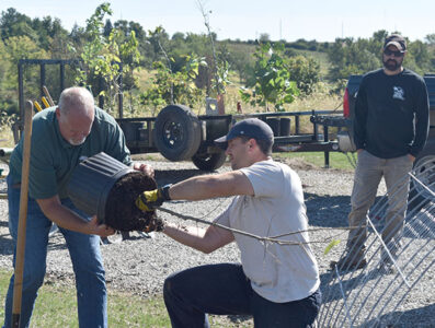 - Trees Forever Field Coordinator Brad Riphagen, left, and Iowa DNR Forester Joe Herring, center, team up to demonstrate the tree planting process while Marshall County Conservation Board Natural Resources Manager Tyler Renze, right, looks on Tuesday afternoon.