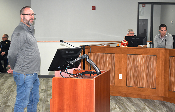 T-R PHOTO BY ROBERT MAHARRY Moler Sanitation Owner Gabe Stone addresses the city council about recommendations related to the recently completed solid waste study during Monday night’s meeting.