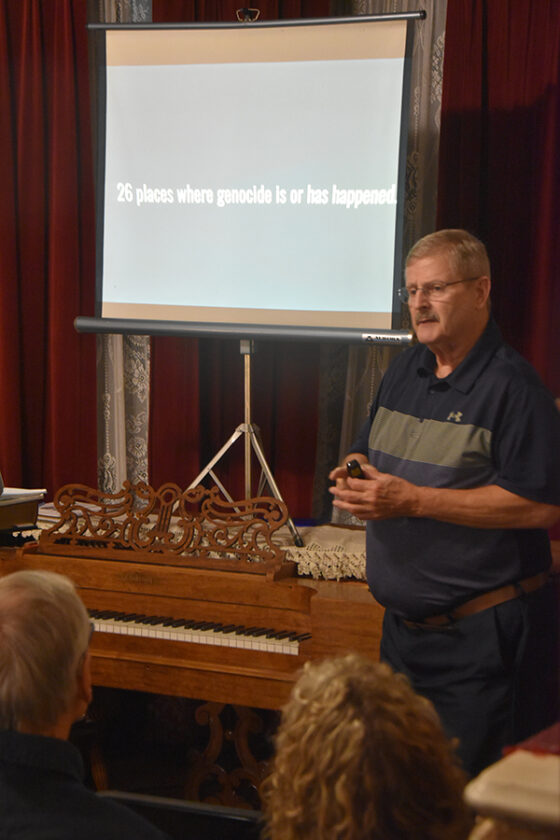 T-R PHOTO BY LANA BRADSTREAM Retired educator Brad Wilkening tells attendees at his Lessons of the Holocaust event at the Mowry Irvine Mansion about circles of care and concern people can work on to help prevent future genocides. He was part of the History on Second Tuesdays program by the Historical Society of Marshall County.