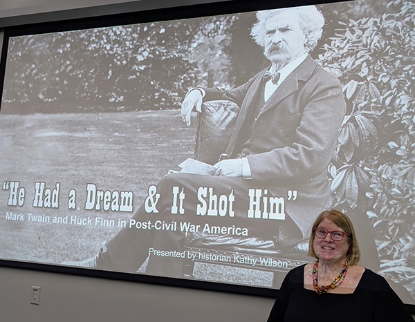 T-R PHOTO BY DORIE TAMMEN Historian Kathy Wilson gave a presentation titled “He Had a Dream and It Shot Him: Mark Twain and Huck Finn in Post-Civil War America” at the Marshalltown Public Library on Thursday.