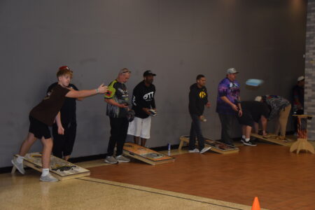 - TJ Painter tosses a bag for his cornhole game during the Switcholio Invitational. Steve Brannick waits his turn to score some points.