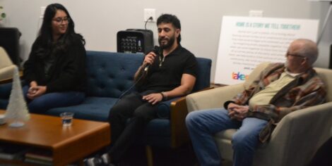 - Miguel Sanchez of Marshalltown – with microphone – shares his story of owning and operating a small business during the “Stories from Our Front Porch” event in Marshalltown Friday night at the Arts + Culture Alliance offices downtown. Looking on are panelists Kimberly Beccera and Dan Wheeler.