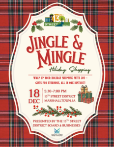 Despite inclement weather resulting in the postponement of the Jingle and Mingle Holiday pop-up event scheduled for Thursday, Dec. 11, the 13th Street District has pivoted to still support an evening of holiday shopping welcoming all businesses and vendors back who have the time availability open on the evening of Thursday, Dec. 18 with an updated time of 5:30 to 7 p.m.