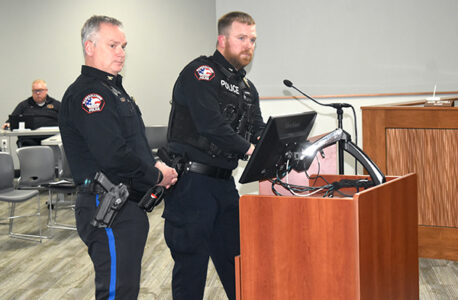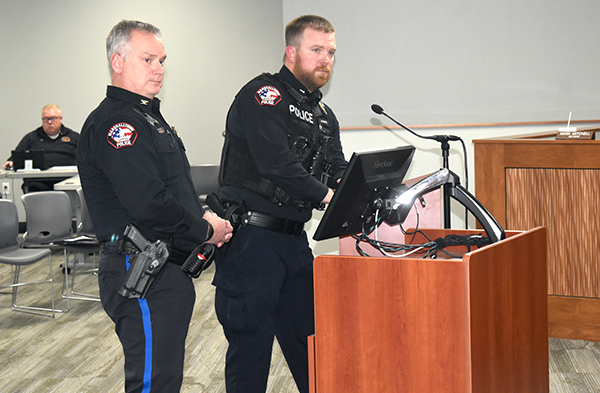 T-R PHOTO BY ROBERT MAHARRY — Marshalltown Police Chief Chris Jones and Capt. Kiel Stevenson discuss public safety cameras with the city council during Monday night’s meeting.
