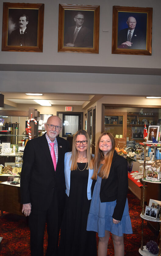 T-R PHOTO BY ROBERT MAHARRY From left to right, Hellberg’s Jewelers owner Vic Hellberg, his daughter Erika Lindblom and granddaughter Summer Lindblom pose for a photo below portraits of the first three generations to operate the long-running Marshalltown store on Friday afternoon. Summer Lindblom, who recently completed schooling at the Gemological Institute of America (GIA), now marks the sixth generation of the family to be involved in the business.
