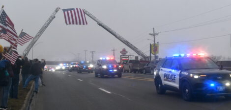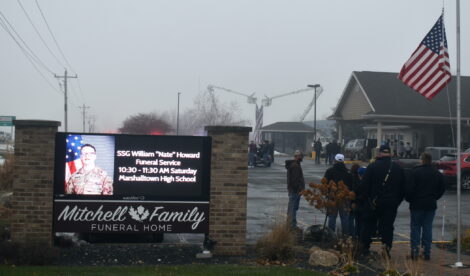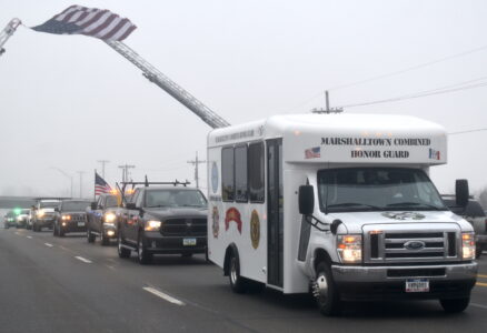 Thousands of mourners lined up along the route before the procession came into town at the intersection of Highway 30 and Highway 14, and the vehicles passed under a giant American flag displayed by the Marshalltown Fire Department. It then moved west on Iowa Avenue toward Mitchell Funeral Home, which is handling Howard’s services. A visitation is set to begin at 9 a.m. on Saturday at the MHS Roundhouse followed by a funeral service at 10:30 a.m. Following the service, full military honors will be held at the high school with the gun volley occurring outside and flag honors inside the Roundhouse.