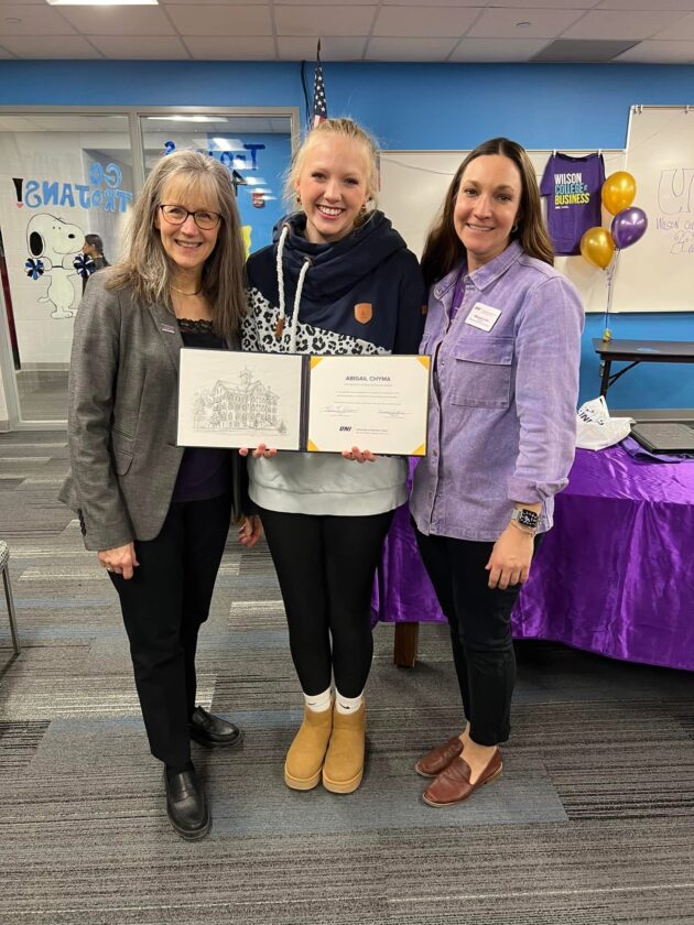 Members of the UNI business department came to Abigail Chyma’s surprise announcement. From left to right Leslie Wilson, Dean of the Wilson College of Business; Chyma; and Elisabeth Soliz, Director of the Office for Professional Distinction. CONTRIBUTED PHOTO