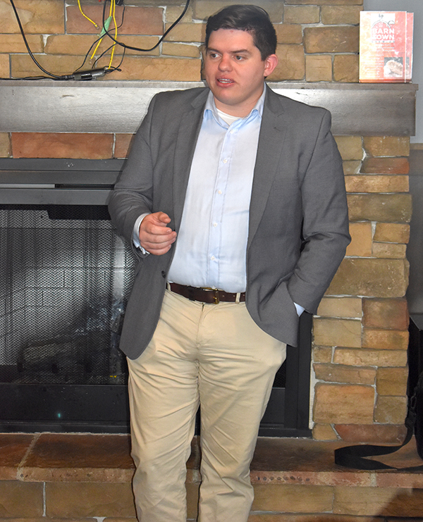 T-R PHOTO BY ROBERT MAHARRY Republican Congressional candidate Christian Schlaefer, a farmer and software consultant from rural Lakota, speaks to the Pachyderm Herd at Legends American Grill in Marshalltown on Friday. Schlaefer, Chris McGowan and Ryan Rhodes are vying for the GOP nomination in Iowa’s Fourth District.
