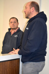 - T-R PHOTOS BY ROBERT MAHARRY — Marshall County Veterans Affairs Commissioner Herschel Edwards, left, and Buildings and Grounds Director Lucas Baedke, right, discuss plans for the use of the courthouse grounds around the new Veterans Memorial during RAGBRAI at Wednesday morning’s regular Board of Supervisors meeting.