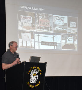 - Iowa Downtown Resource Center Director Jim Engle gives a presentation on downtown essentials for small towns at West Marshall High School in State Center on Wednesday morning. He and Iowa Economic Development Authority (IEDA) Downtown Economic Development Specialist Jim Thompson gave the same presentation at East Marshall Elementary School in Laurel that evening.