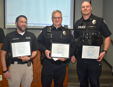 - From left to right, Det. Kraig Lageschulte (20 years), Chief Chris Jones (30 years) and Lt. Chad Hillers (20 years) were honored for their years of service to the Marshalltown Police Department during Monday night’s meeting.