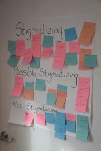 Rader spoke about the stigma surrounding mental health, and how it makes it hard for people to talk about what they are struggling with. She asked participants to write on sticky notes three phrases they had heard people use when talking about mental health challenges. Then they were to place the notes in corresponding categories – Stigmatizing, Possibly Stigmatizing or Not Stigmatizing. Most of the answers were considered stigmatizing.