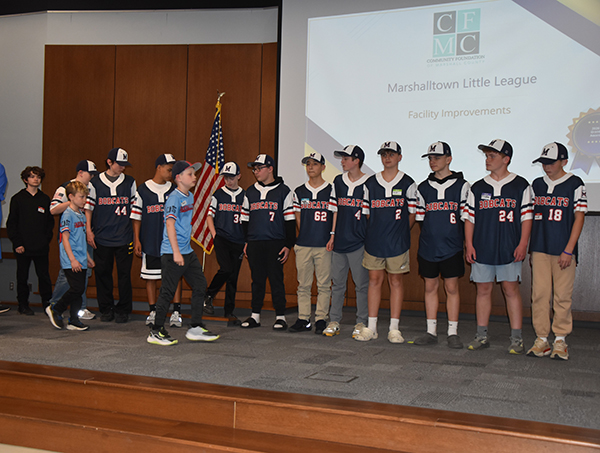 T-R PHOTO BY LANA BRADSTREAM Players of the Marshalltown Little League gather to collect a grant from the Community Foundation of Marshall County for facility improvements. The grant ceremony was held yesterday at the Marshalltown Community College.