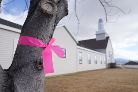 - A pink ribbon hangs on a tree outside the Church of Jesus Christ of Latter-Day Saints, Thursday in Lyman, Utah, in honor of a woman that was killed a day earlier.