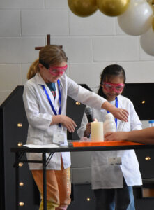 - Adoniah Hansen and Si Hser, showcasing the importance of safety by wearing goggles, create a baking soda and vinegar “volcano” during the annual MCS Royals Talent Show.