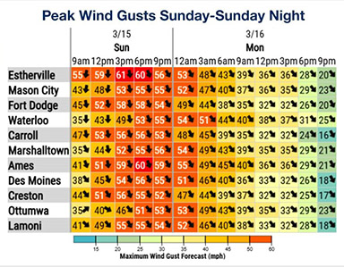 - SUBMITTED IMAGES — The National Weather Service displays the predicted snow falls and wind gusts for Marshalltown and other locations across the state. The blizzard struck on Sunday and lasted until Monday morning.